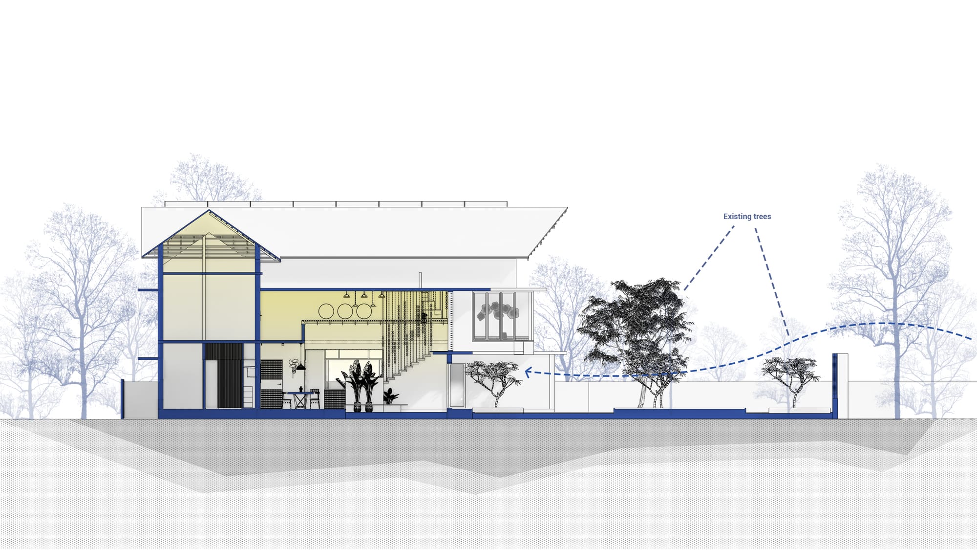 A water body is designed which bridges in a relation between the existing nutmeg tress to the interior spaces.