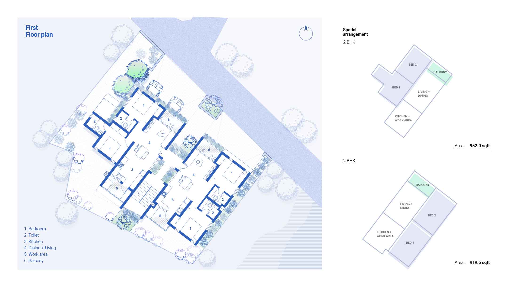 The design emphasizes natural light and ventilation, ensuring that each unit feels airy and open. Expansive windows offer sweeping views of the surrounding greenery, bringing the outdoors into the living space, fostering a sense of tranquility and connection to nature. The interior spaces are planned to maximize functionality without compromising on style, using clean lines and a minimalist approach to enhance the sense of spaciousness.