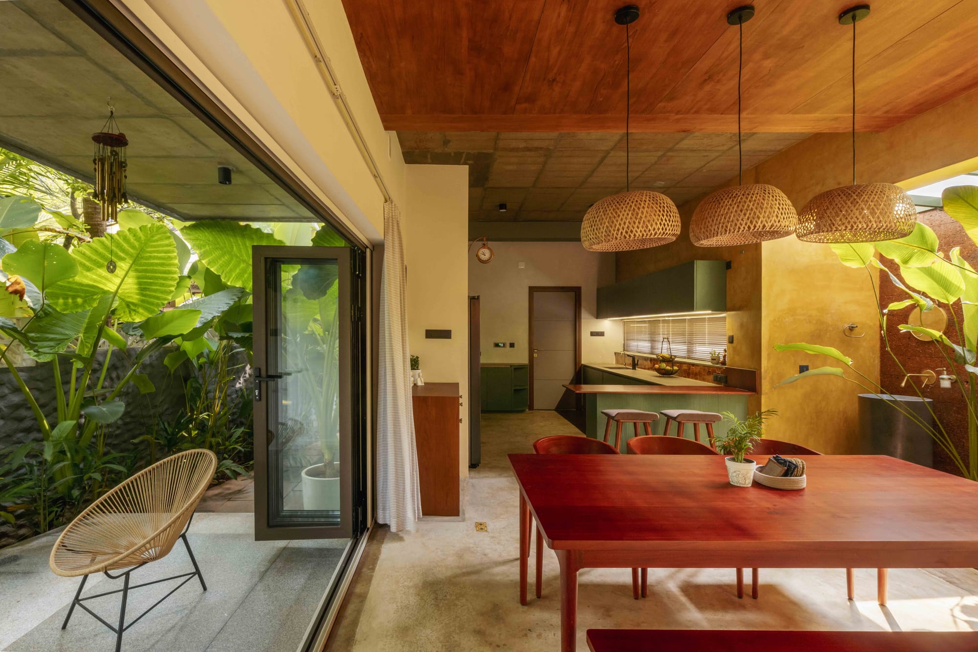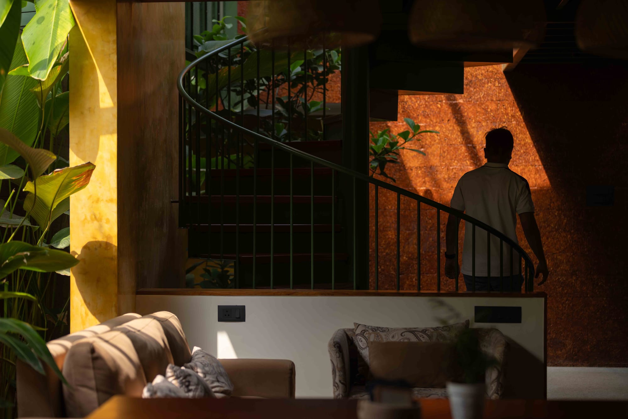 The design response evolved into a layered home where light, vegetation, and earthy textures become primary architectural elements.