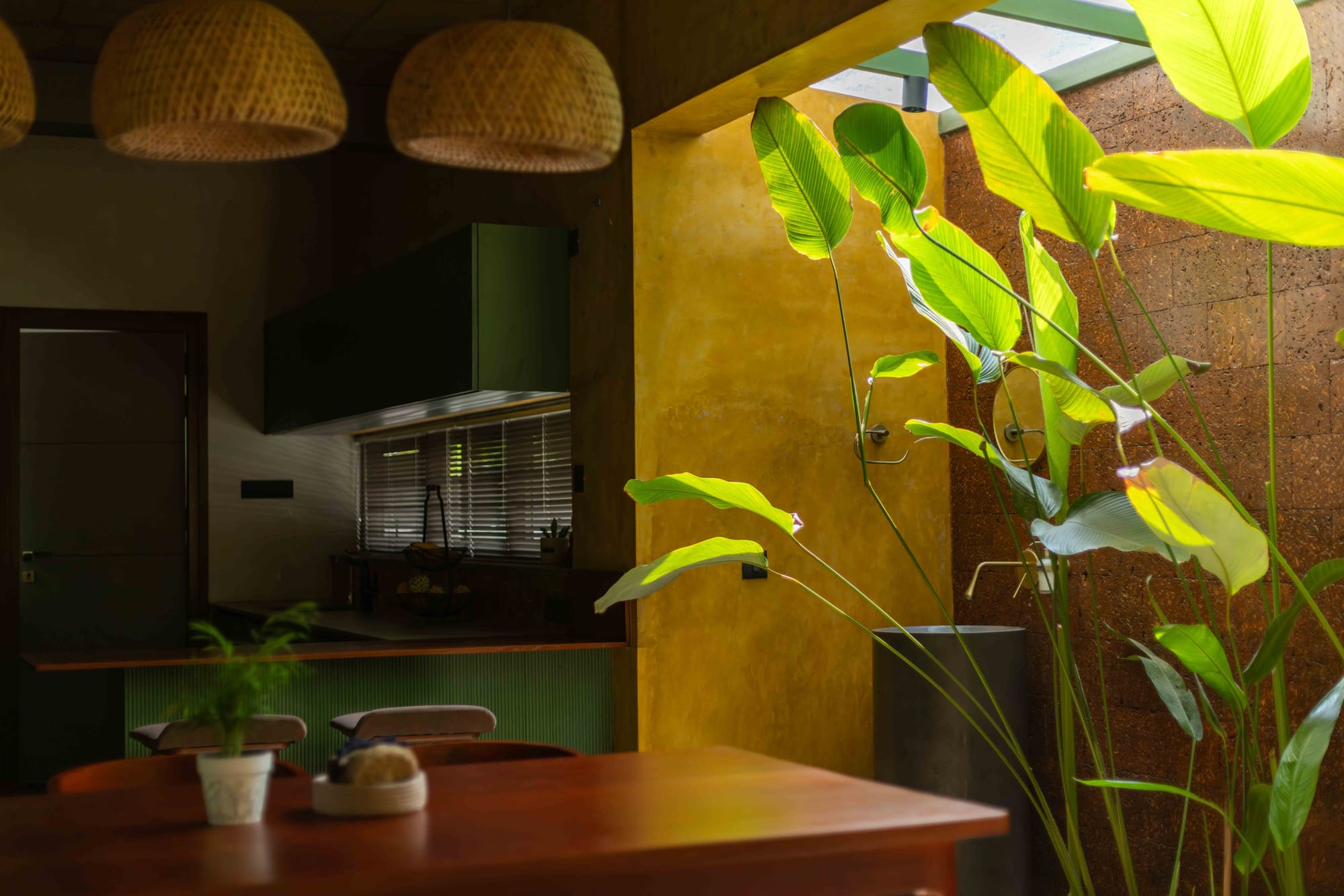 Diffuse daylight enters through large openings fitted with sheer Roman blinds, offering privacy while allowing a gentle glow that animates the interiors throughout the day.