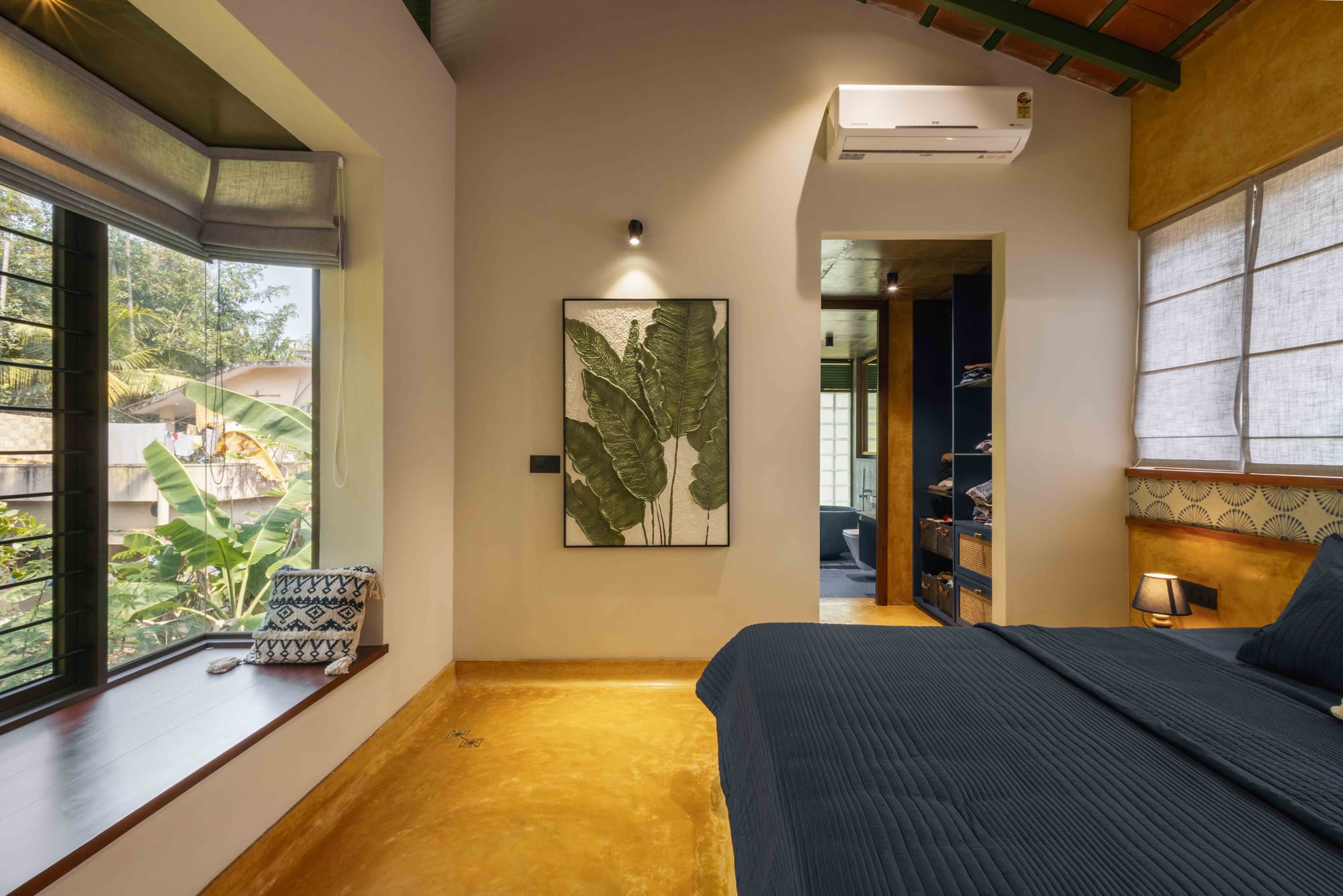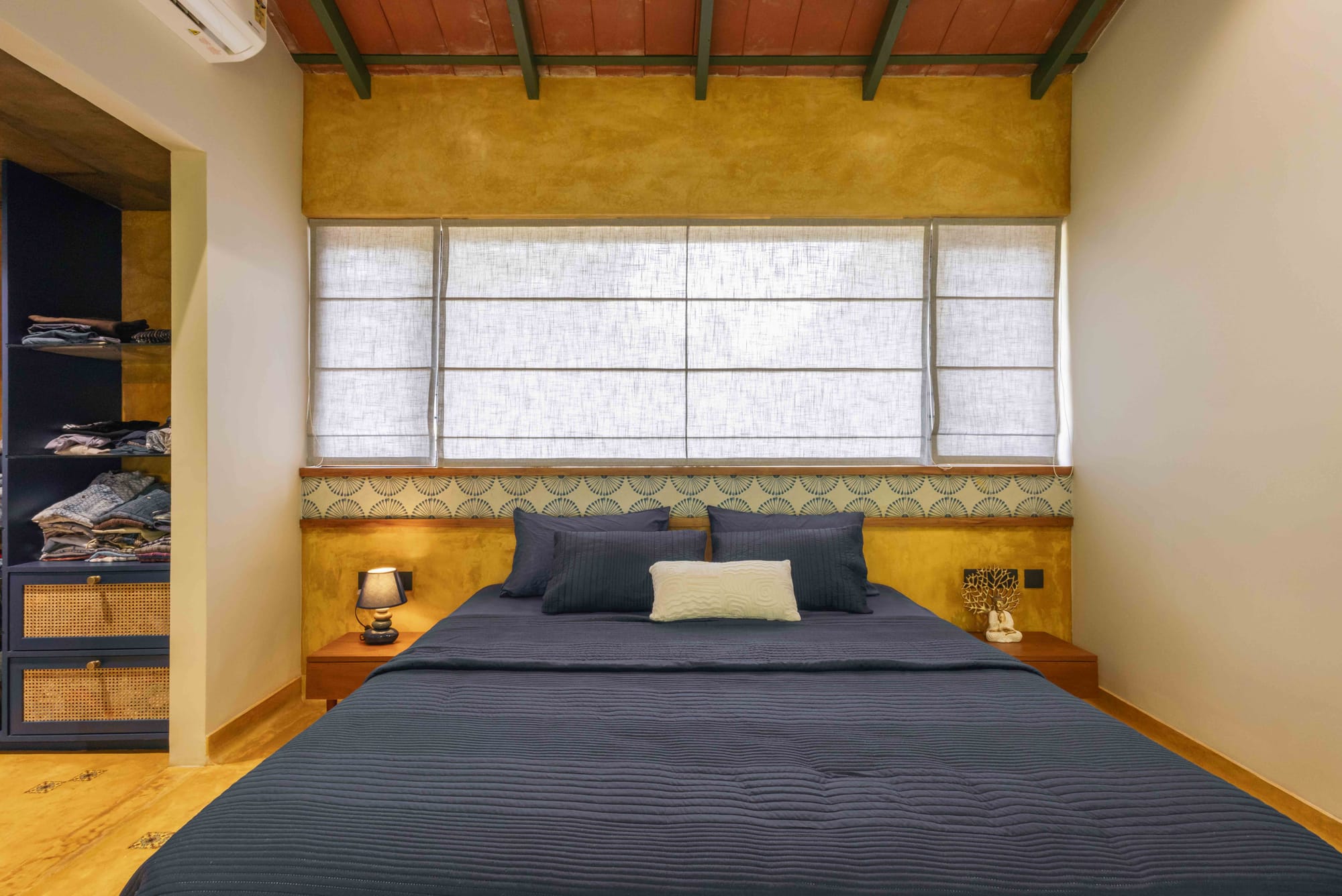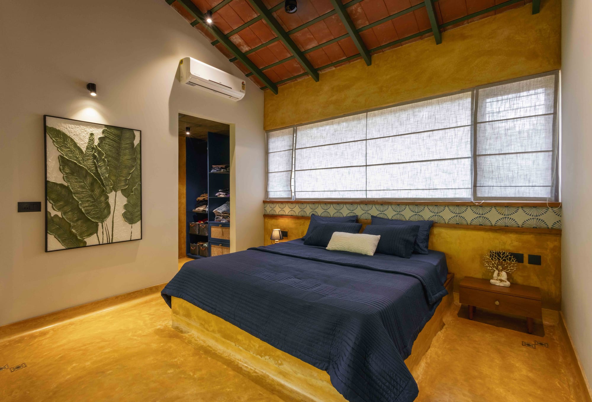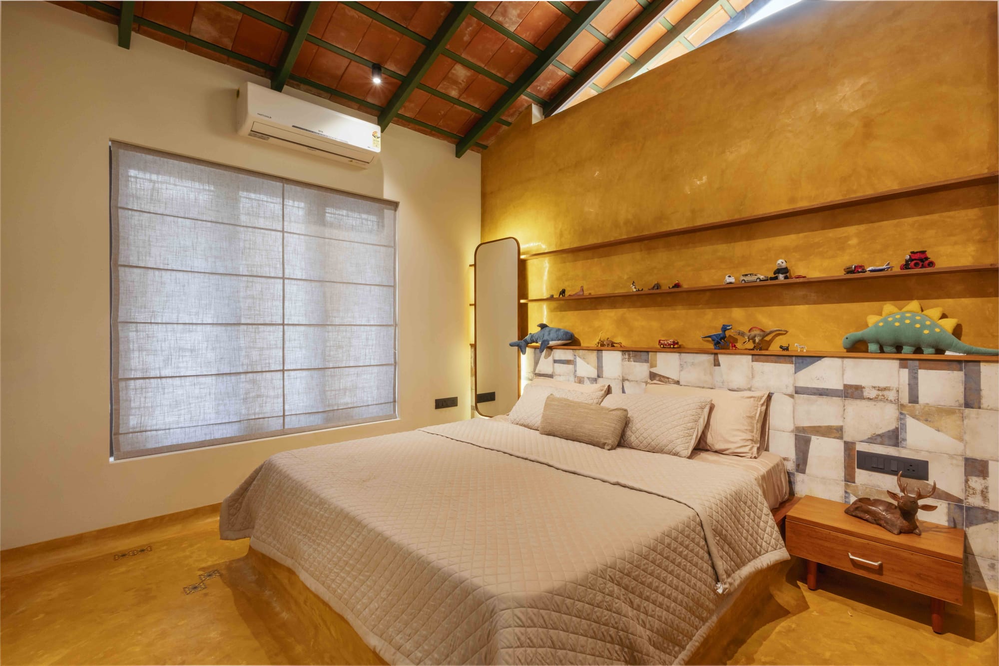 Both bedrooms sit under a pitched roof lined with exposed terracotta tiles and green steel rafters—an expressive ceiling that adds height, warmth, and identity to the spaces. The oxide plaster walls echo the tones of the floor, creating a continuous envelope that feels handcrafted and tactile.