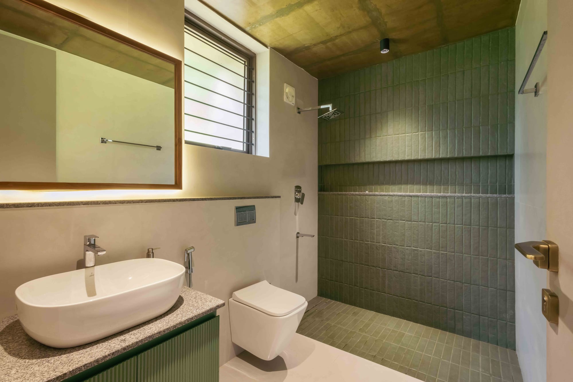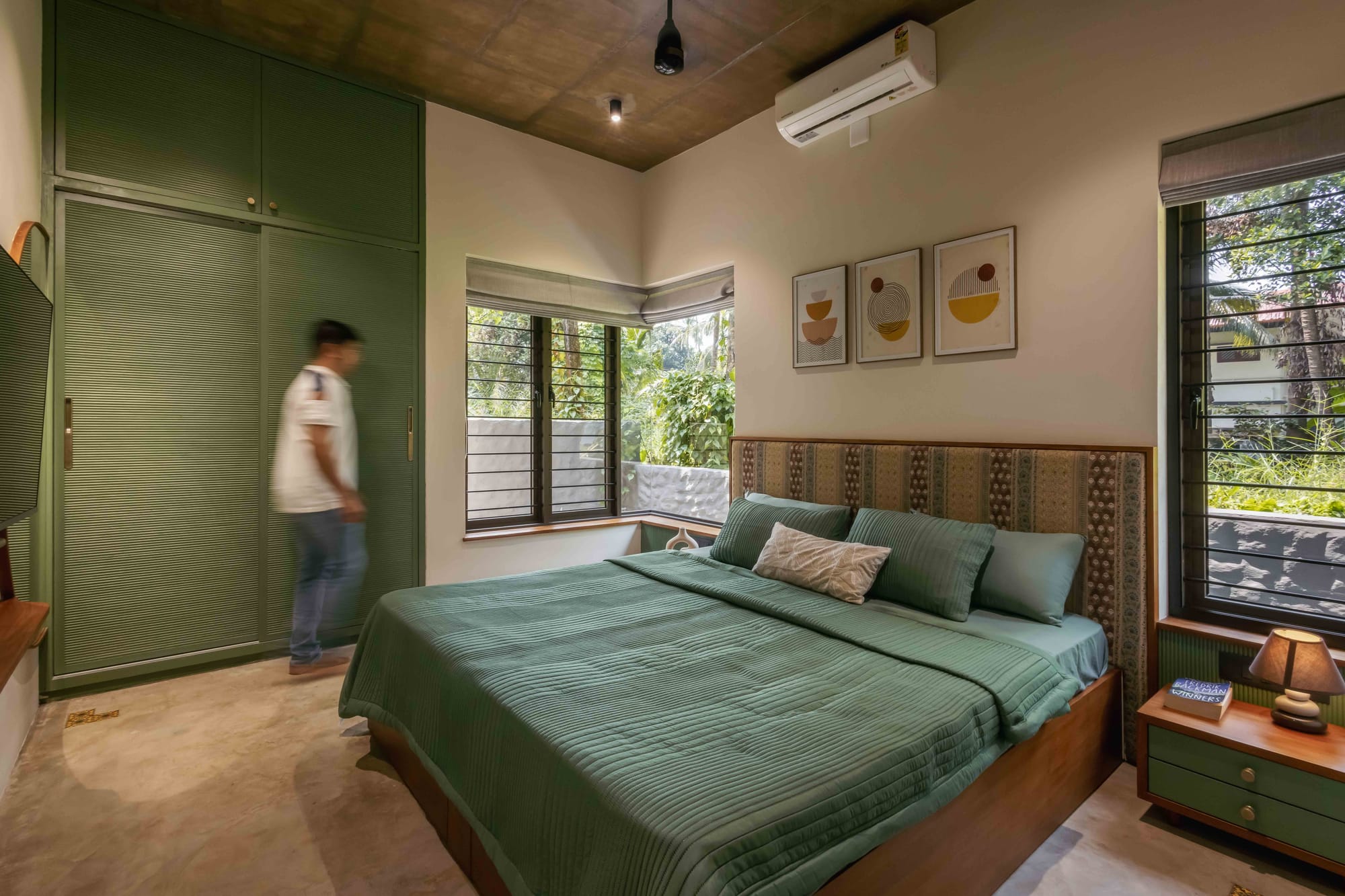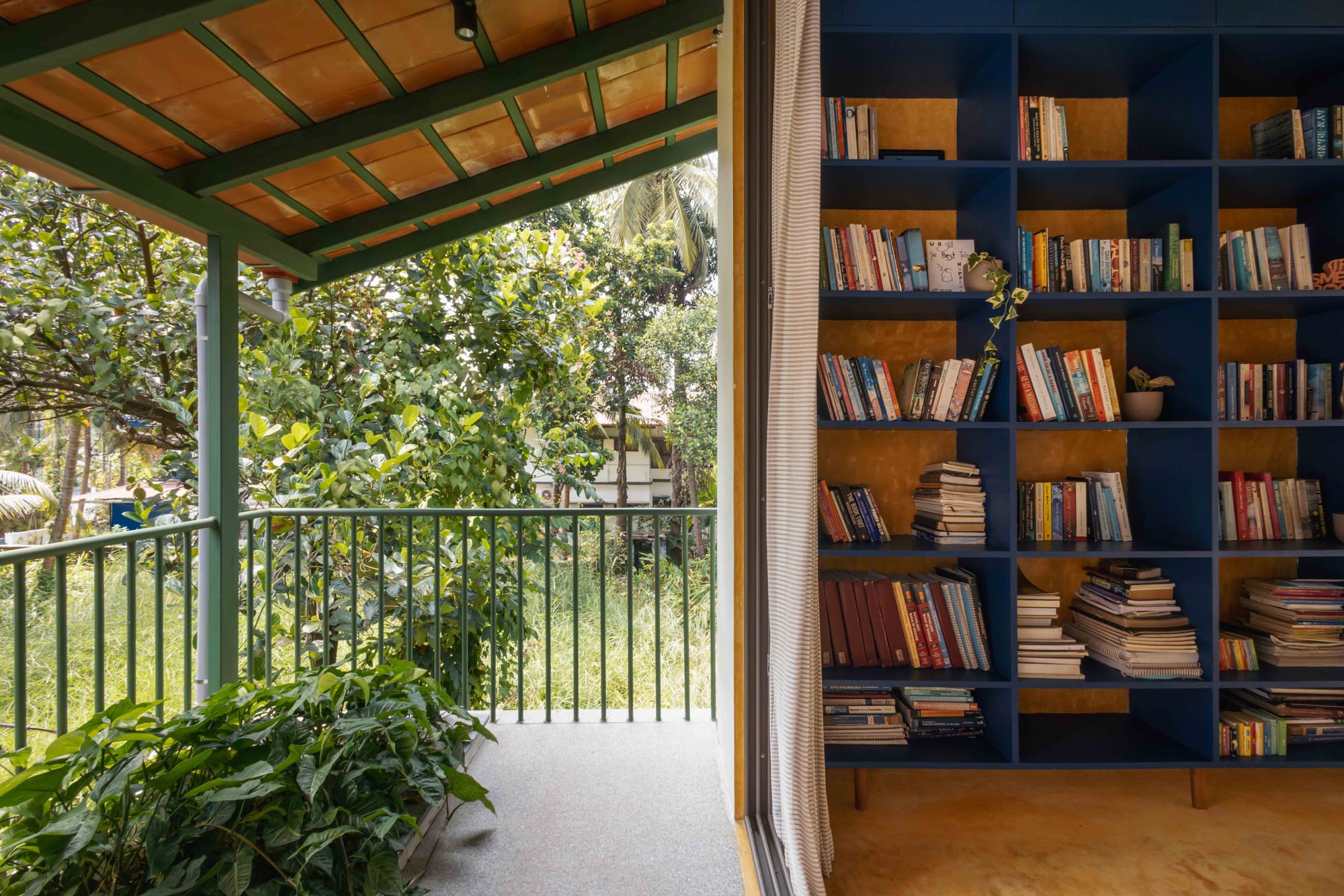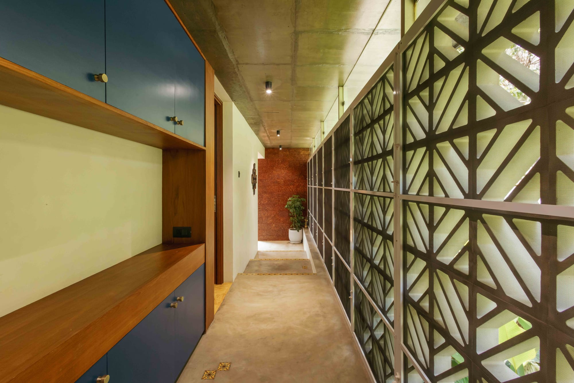 Both bedrooms sit under a pitched roof lined with exposed terracotta tiles and green steel rafters—an expressive ceiling that adds height, warmth, and identity to the spaces. The oxide plaster walls echo the tones of the floor, creating a continuous envelope that feels handcrafted and tactile.