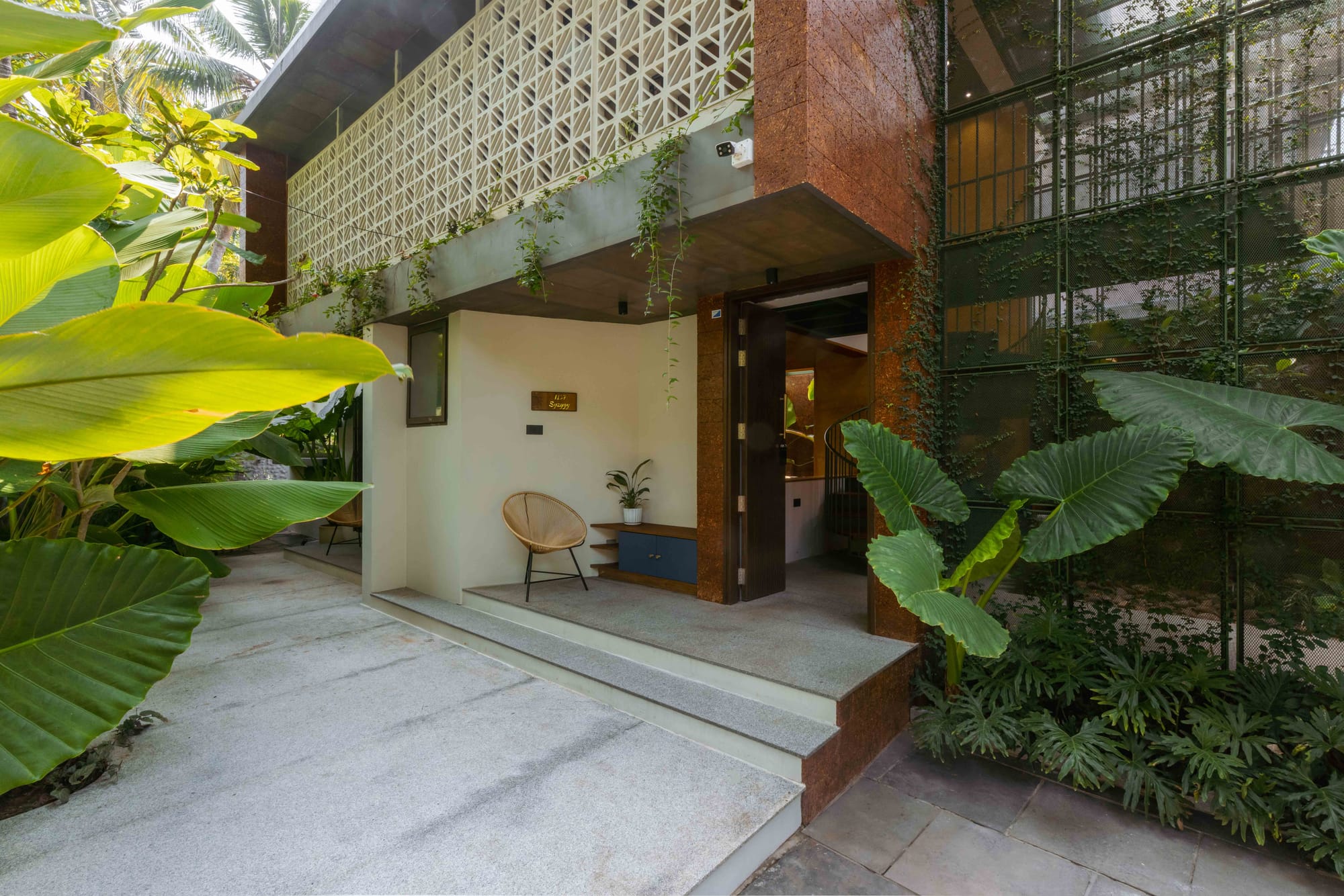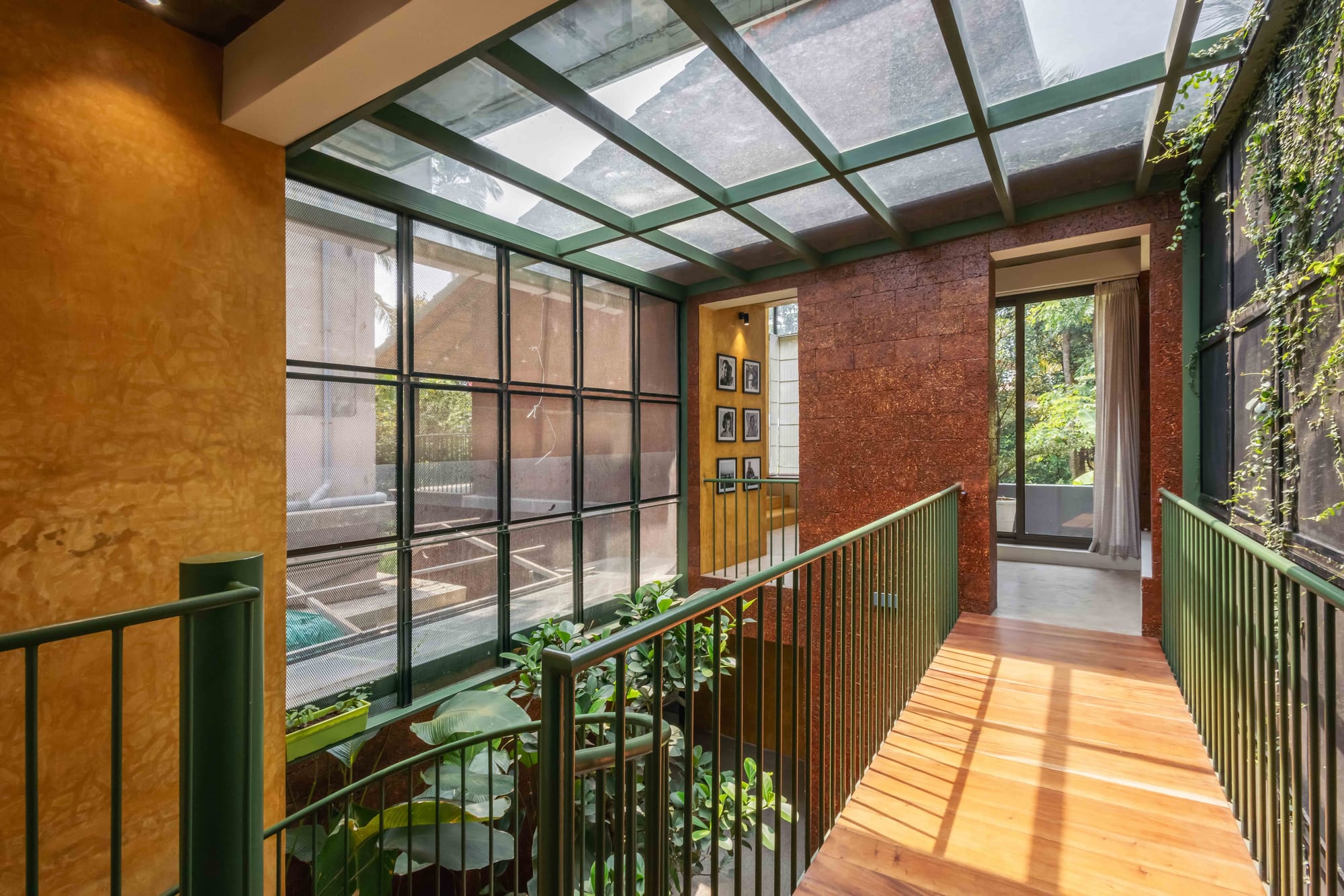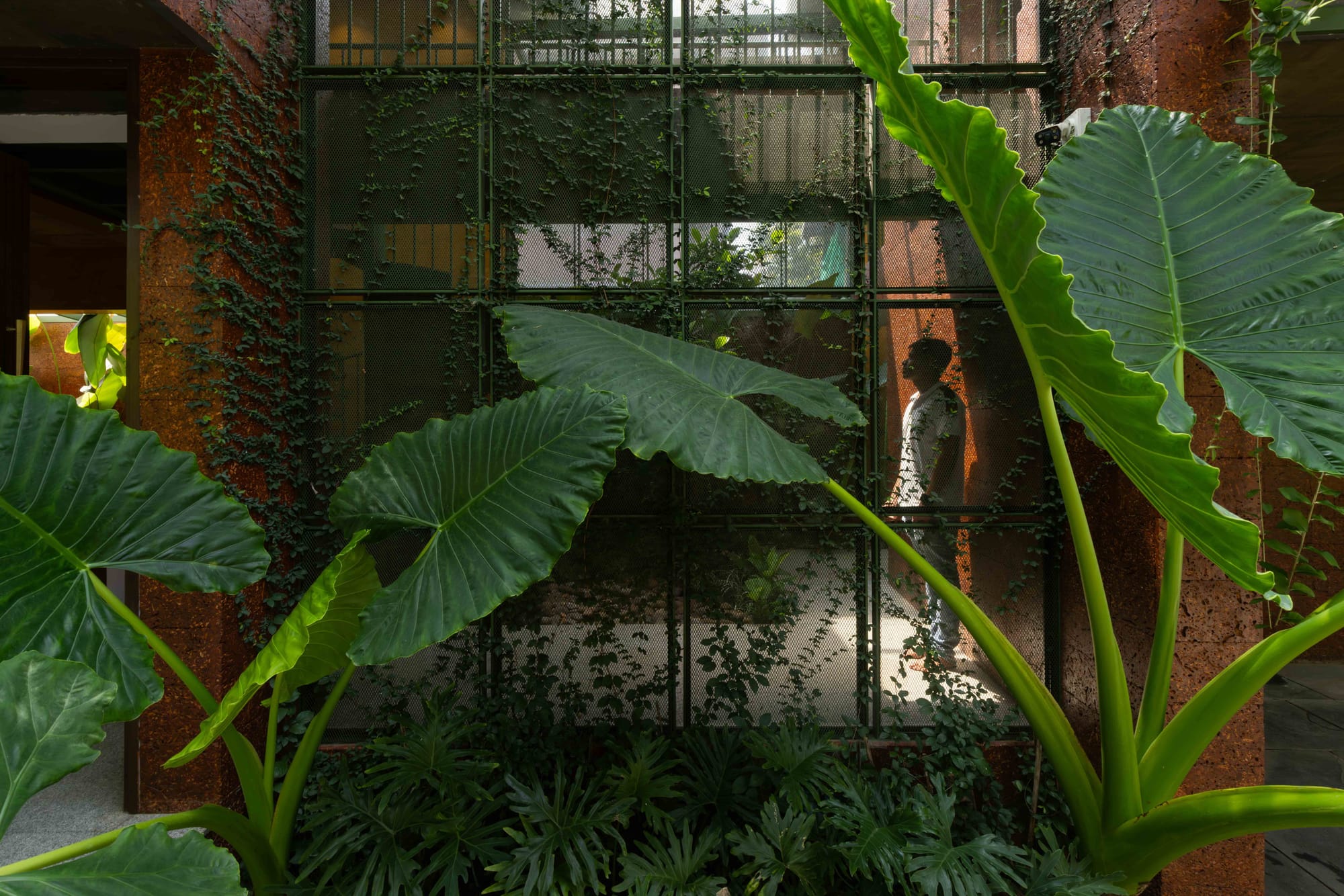 Custom metal screens and a layer of creepers mediate sunlight through the day.