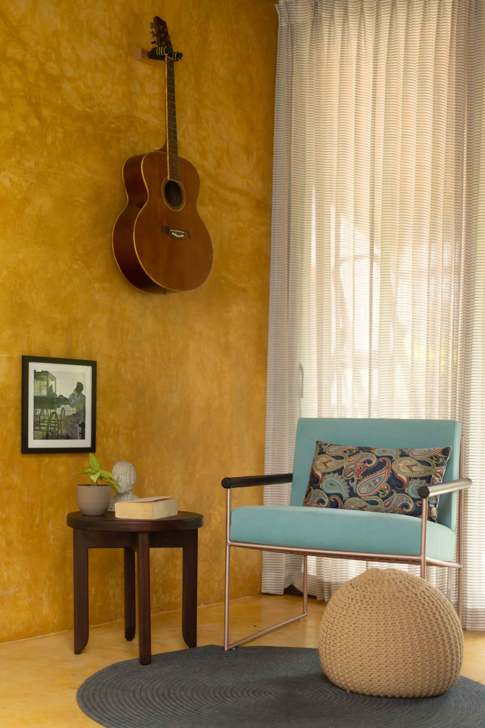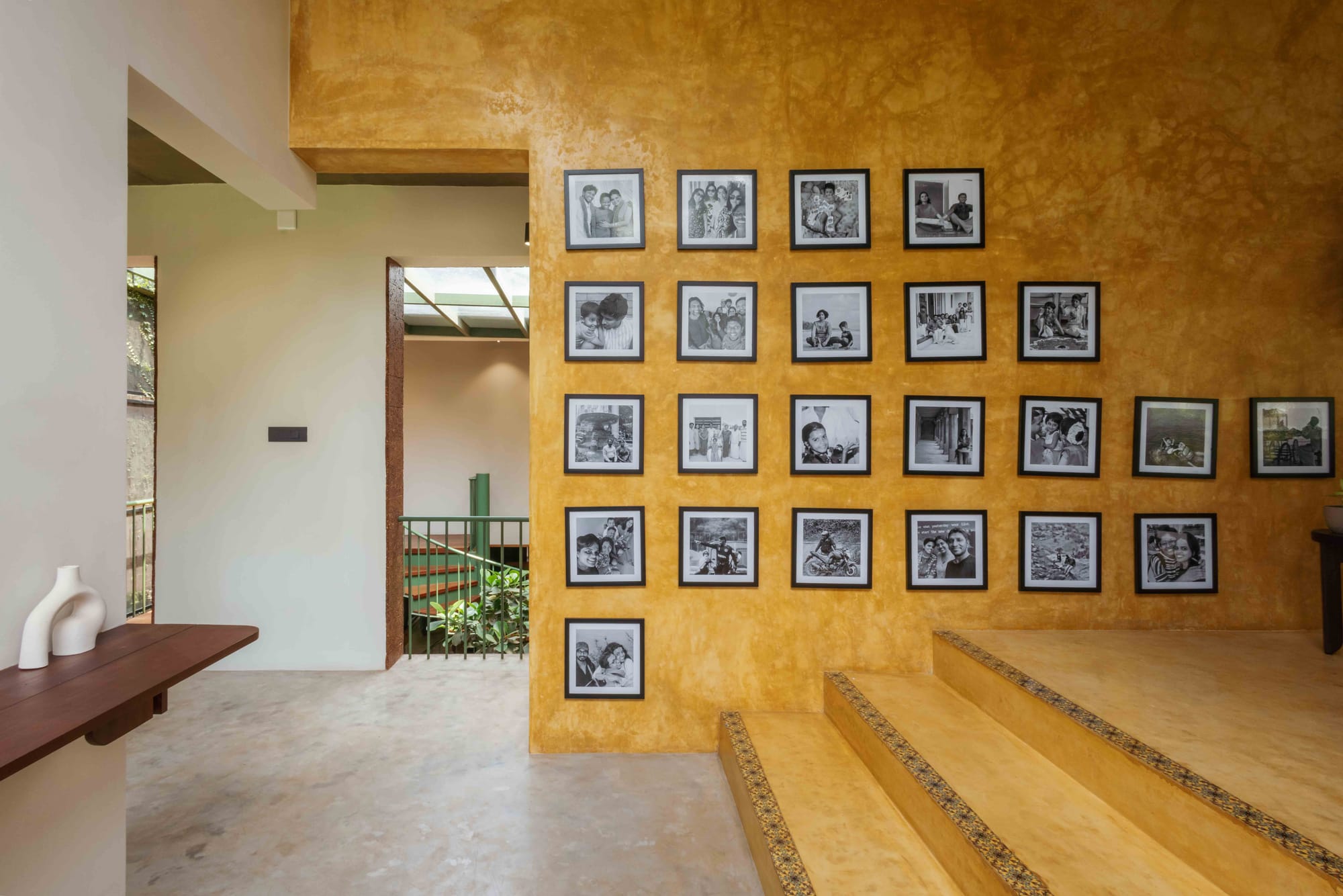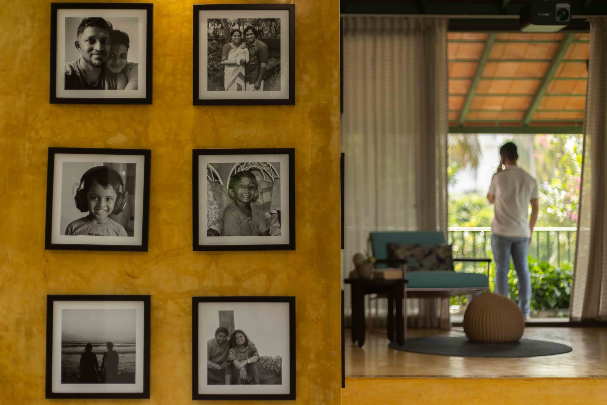 Arranged as a grid against the golden backdrop, these monochrome images transform the room into a deeply personal narrative—turning architecture into an emotional archive.