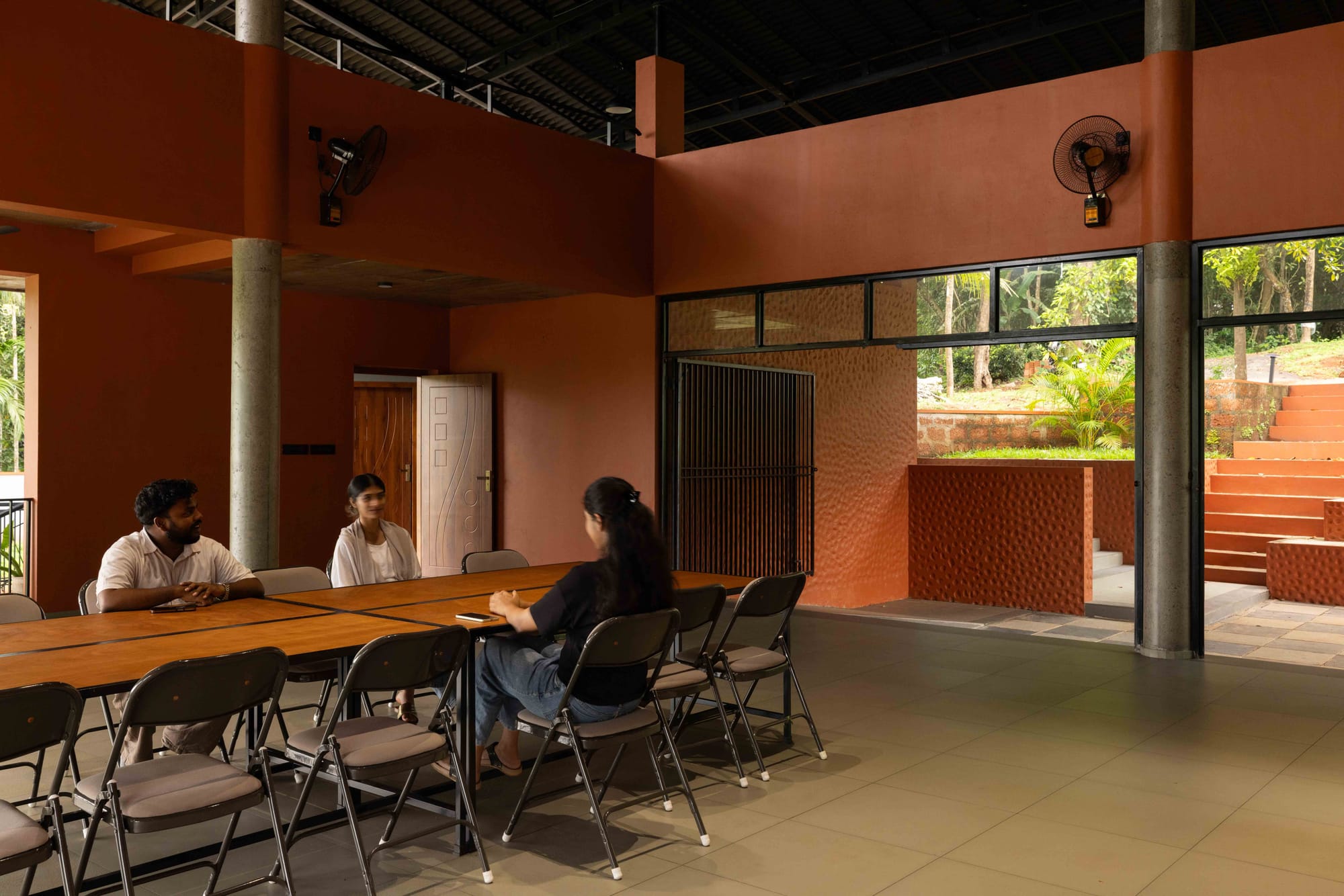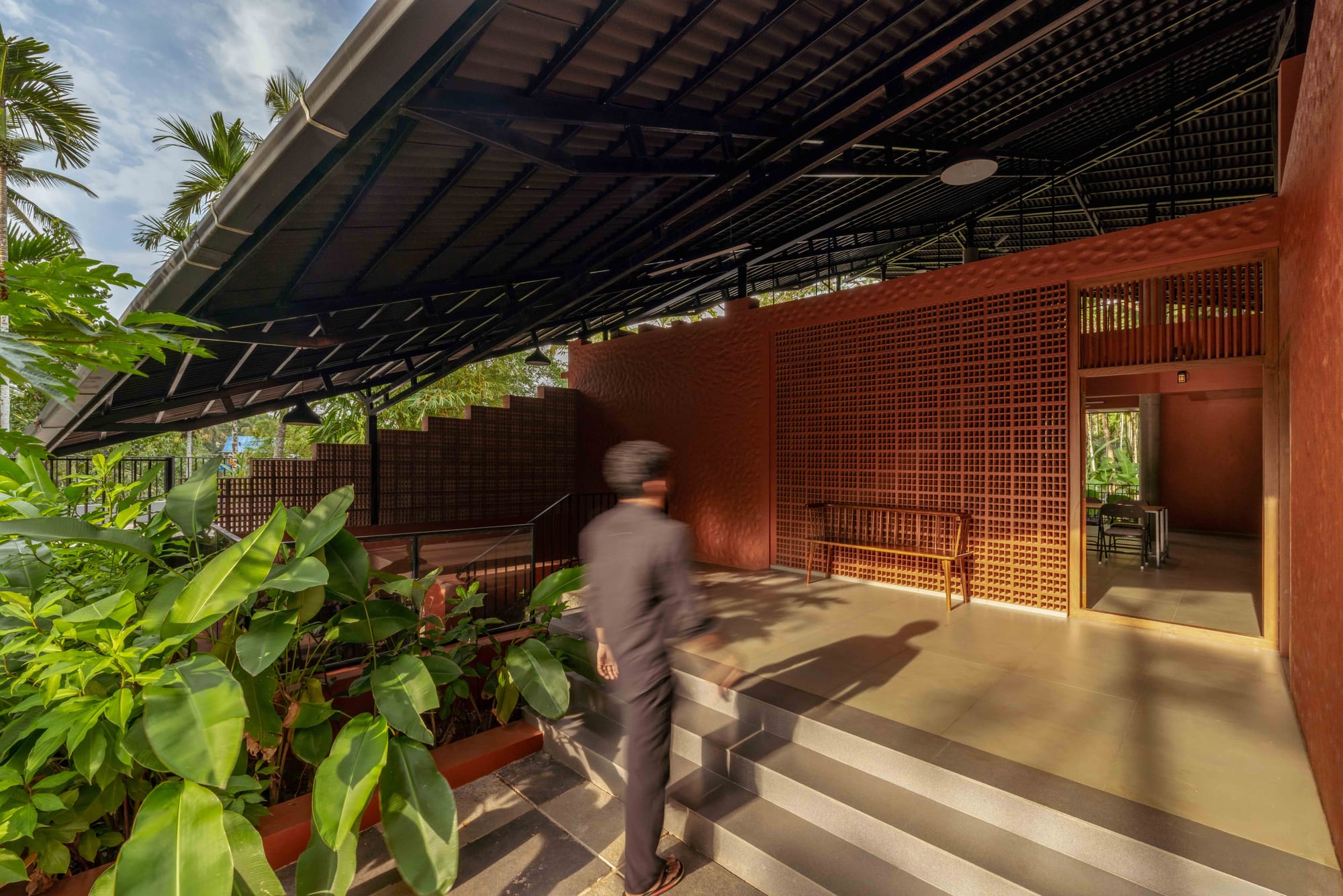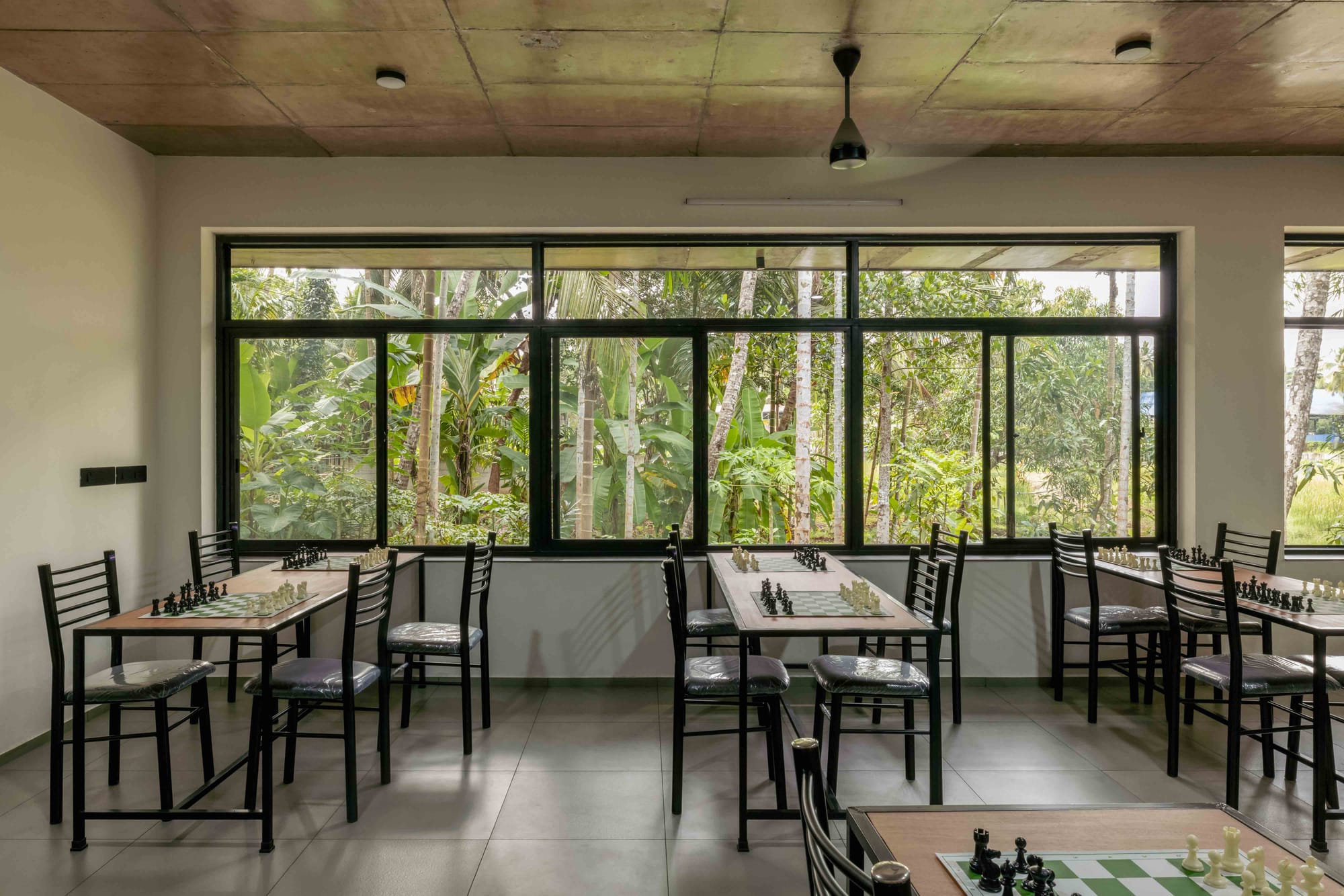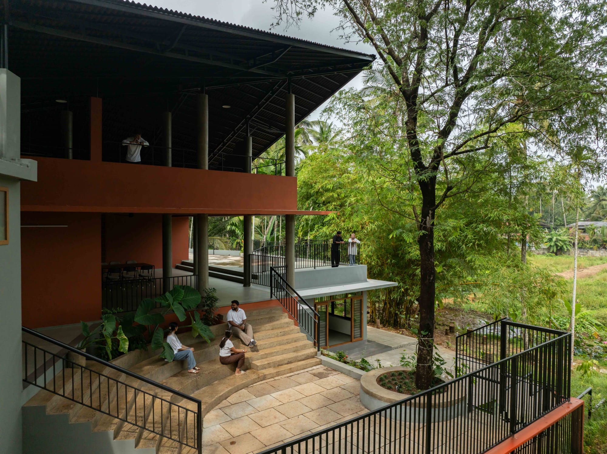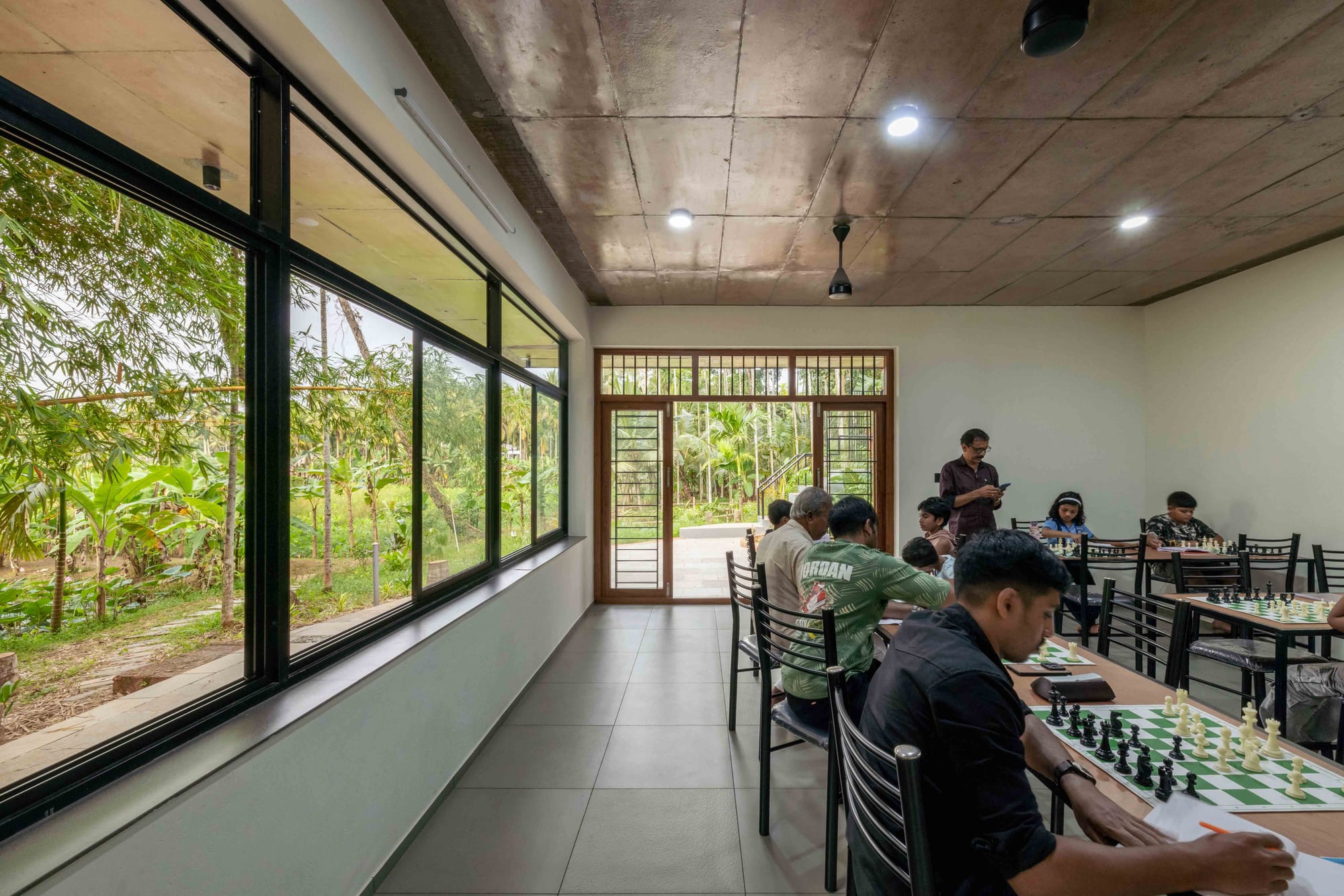 The built form is organised around existing trees and contours, with the roof responding to the canopy lines. Open verandahs, stepped seating, and shaded platforms allow the activities—chess training, talks, small gatherings—to flow seamlessly between indoor and outdoor spaces. Materiality is restrained and earthy: oxide finishes, terracotta jaalis, exposed concrete, and recycled roofing sheets blend the structure into the plantation setting.