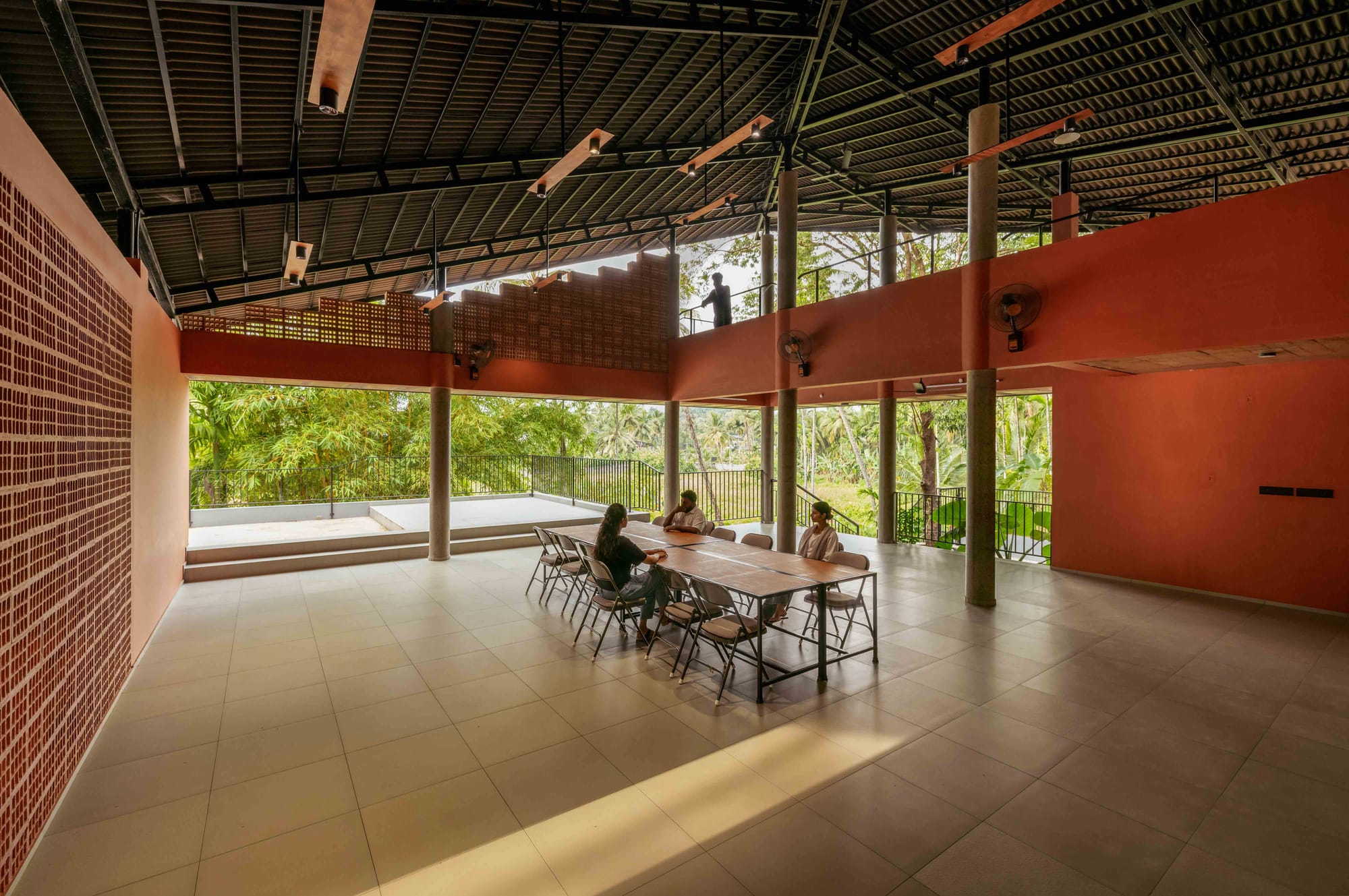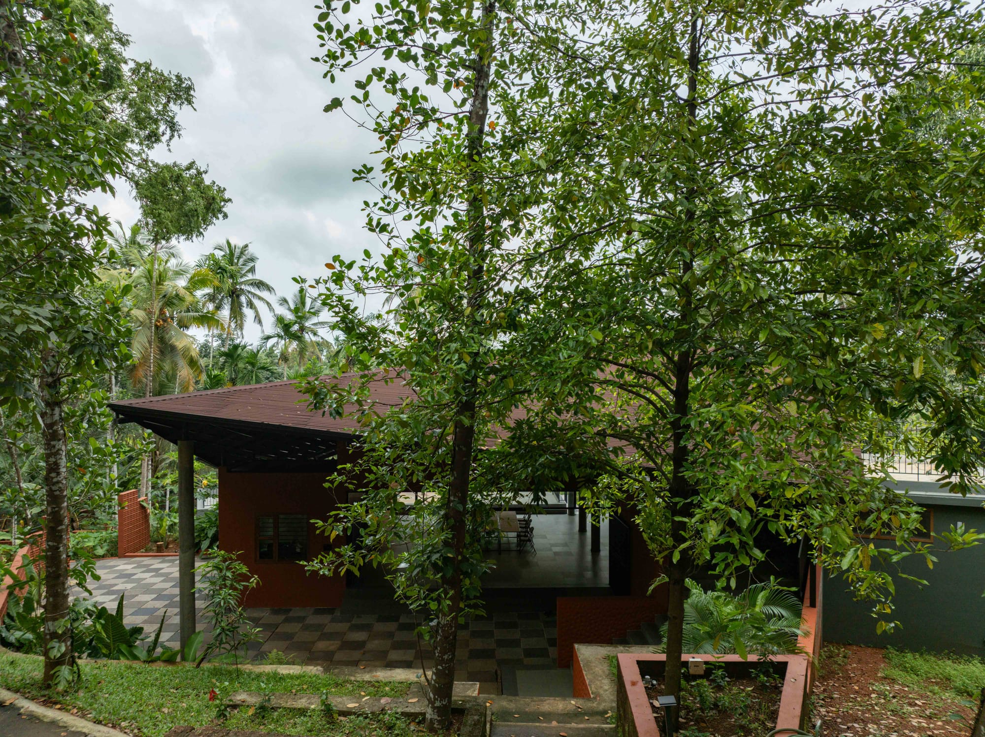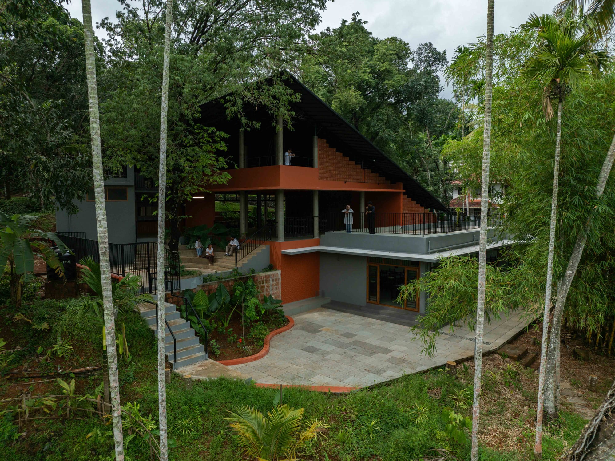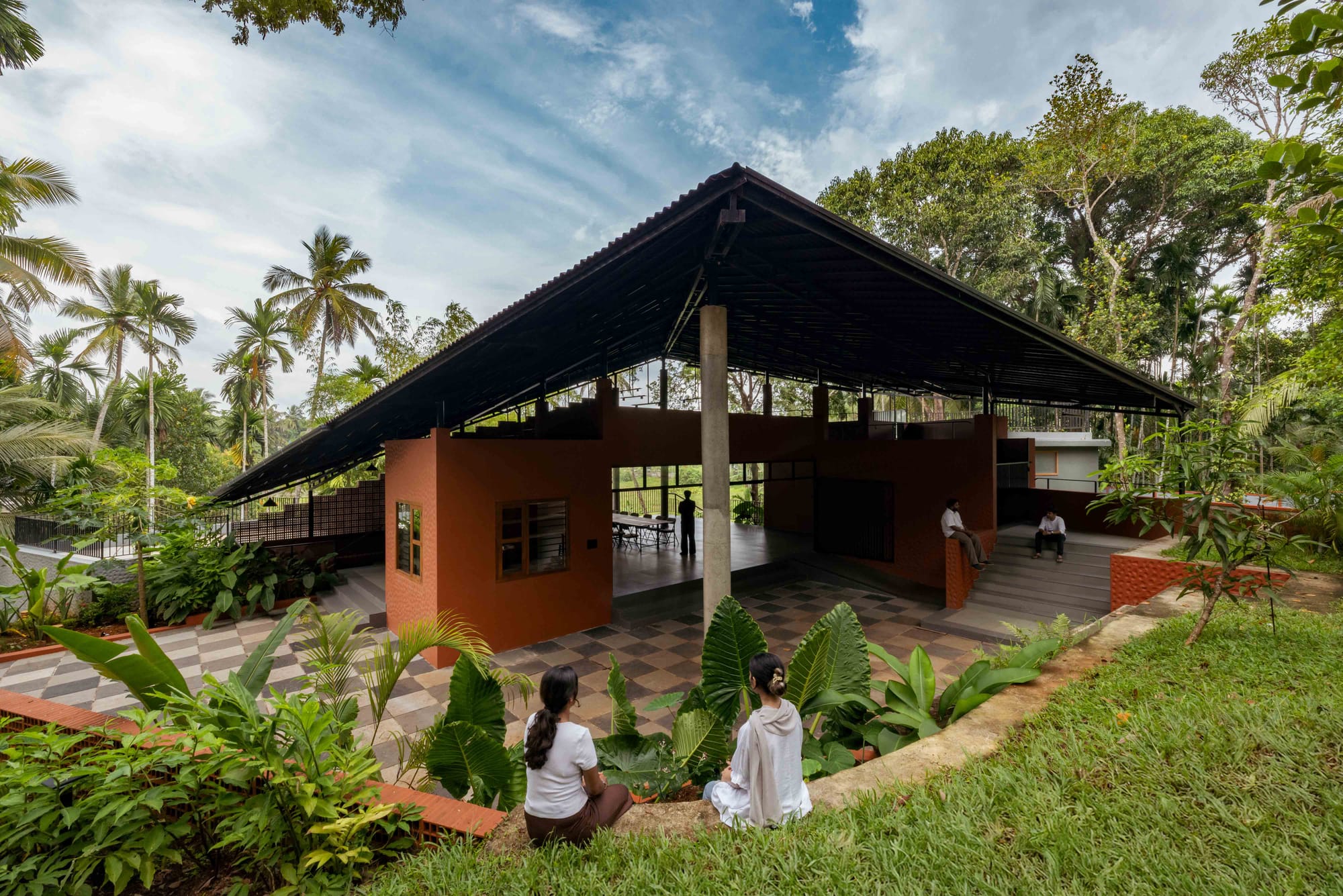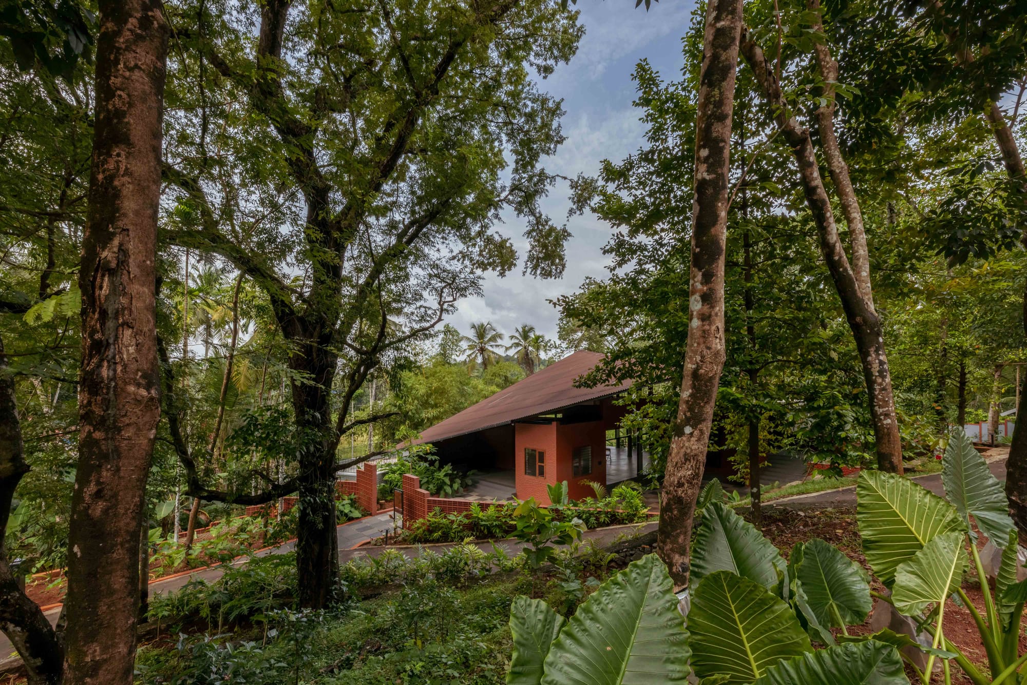 The built form is organised around existing trees and contours, with the roof responding to the canopy lines. Open verandahs, stepped seating, and shaded platforms allow the activities—chess training, talks, small gatherings—to flow seamlessly between indoor and outdoor spaces. Materiality is restrained and earthy: oxide finishes, terracotta jaalis, exposed concrete, and recycled roofing sheets blend the structure into the plantation setting.