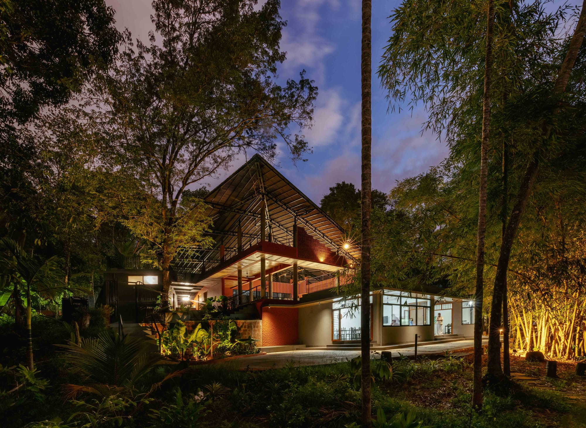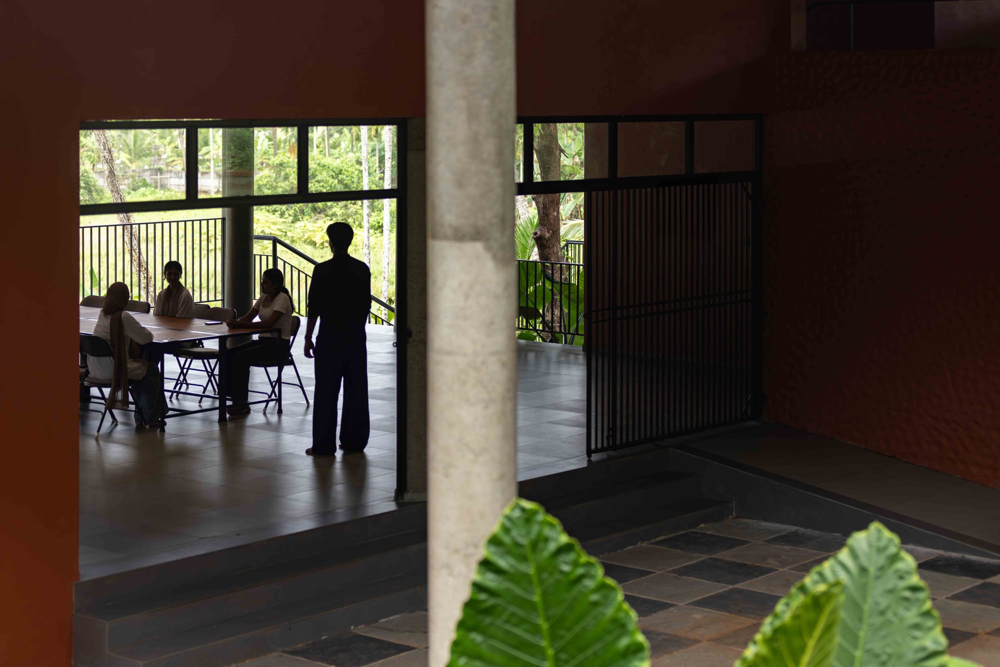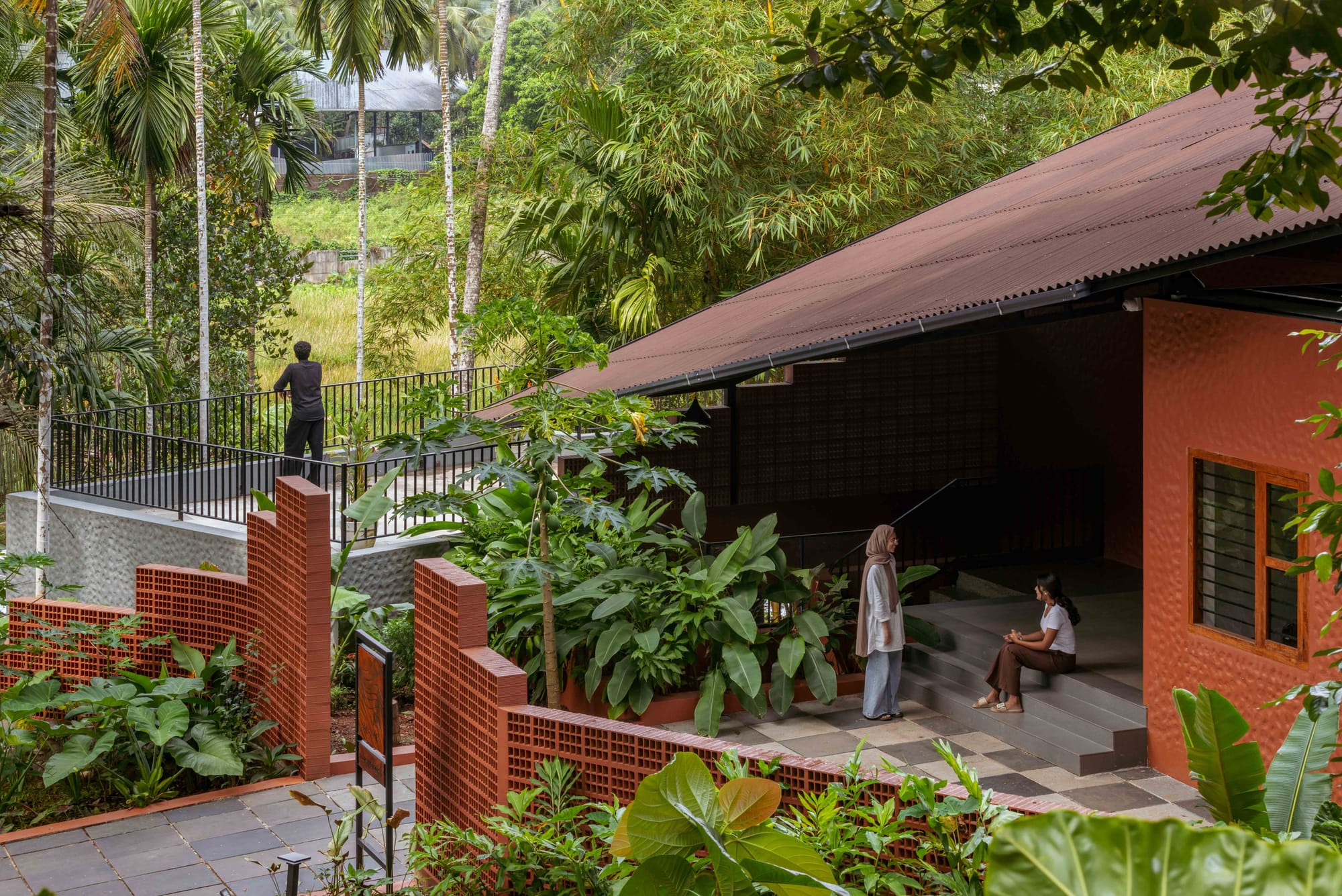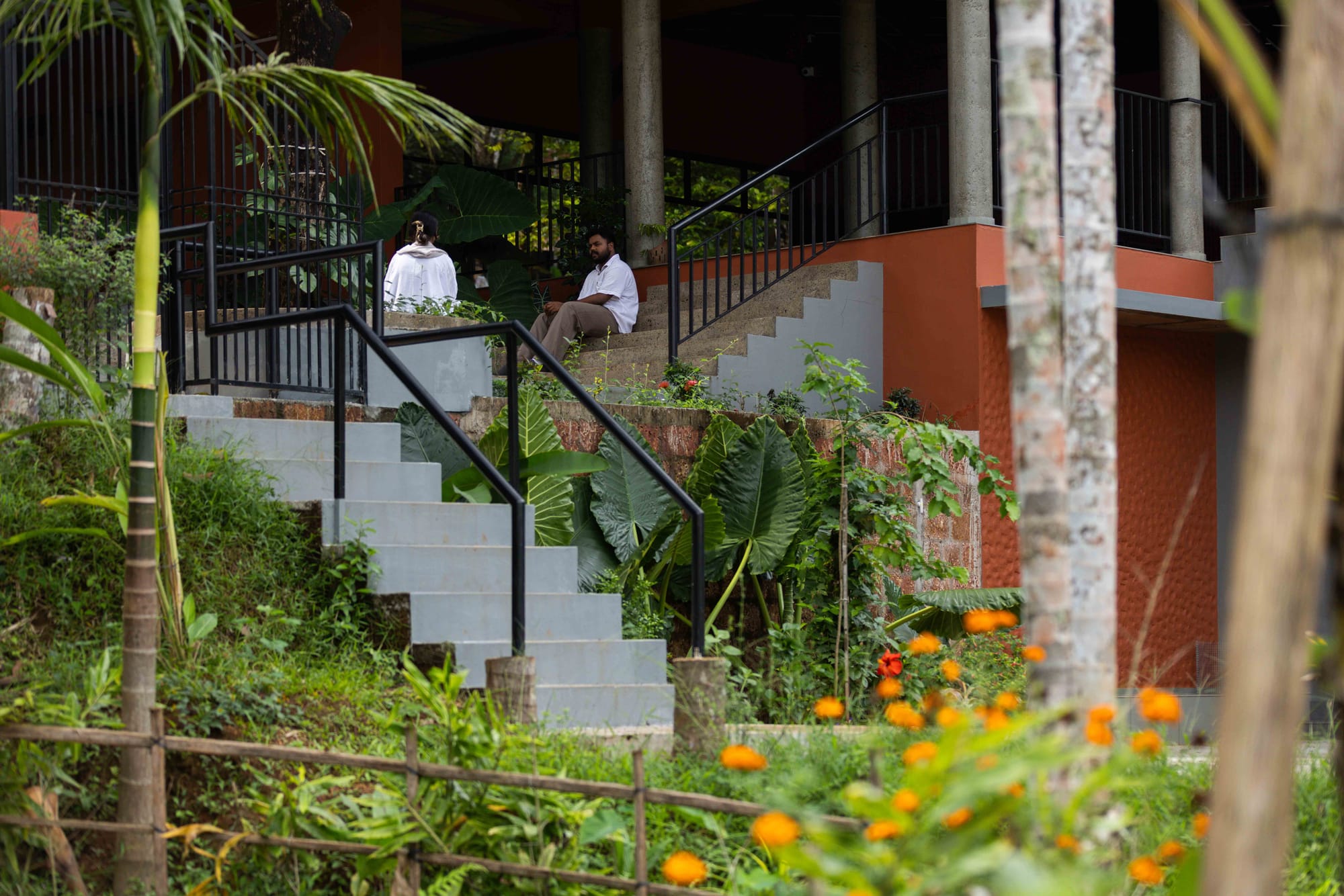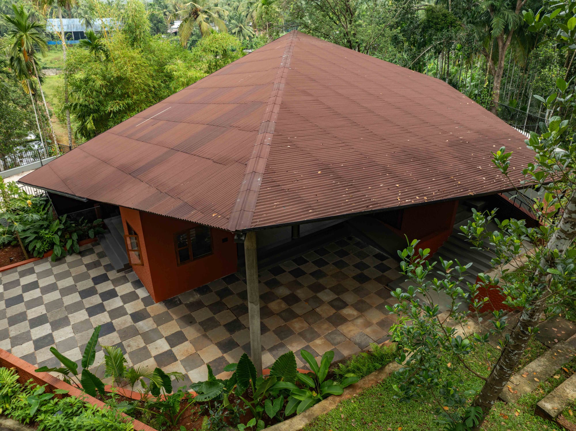 The built form is organised around existing trees and contours, with the roof responding to the canopy lines. Open verandahs, stepped seating, and shaded platforms allow the activities—chess training, talks, small gatherings—to flow seamlessly between indoor and outdoor spaces. Materiality is restrained and earthy: oxide finishes, terracotta jaalis, exposed concrete, and recycled roofing sheets blend the structure into the plantation setting.