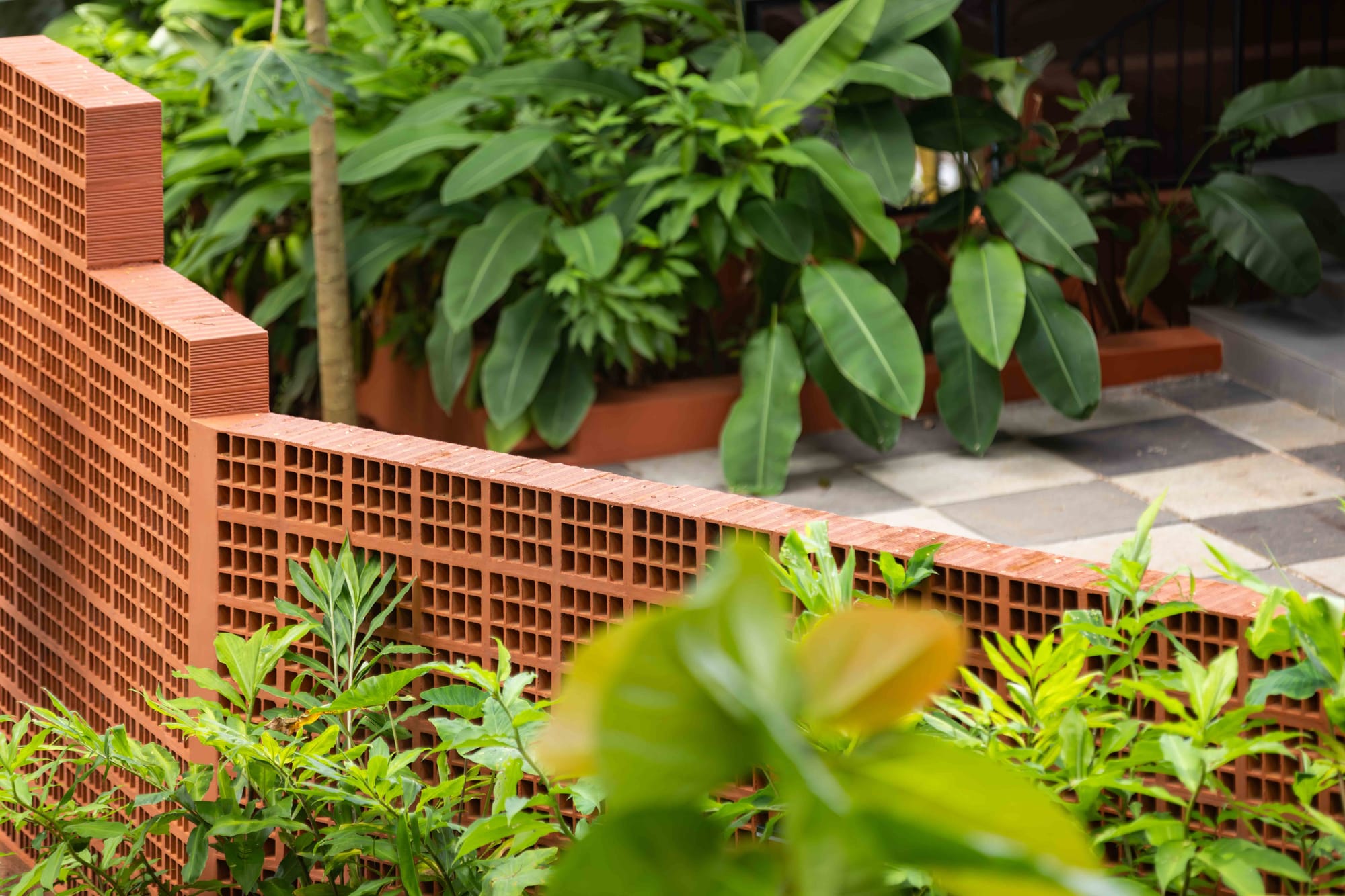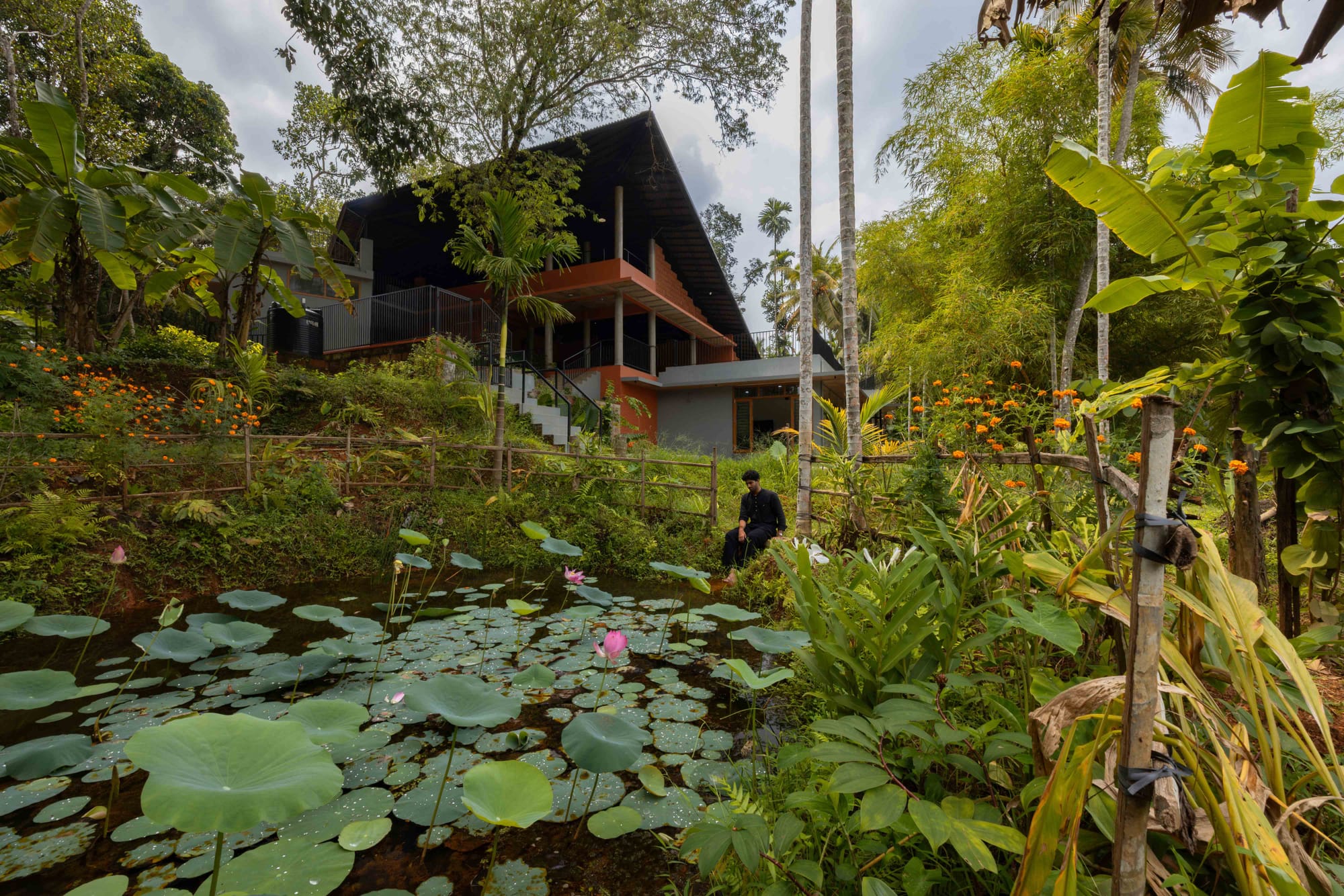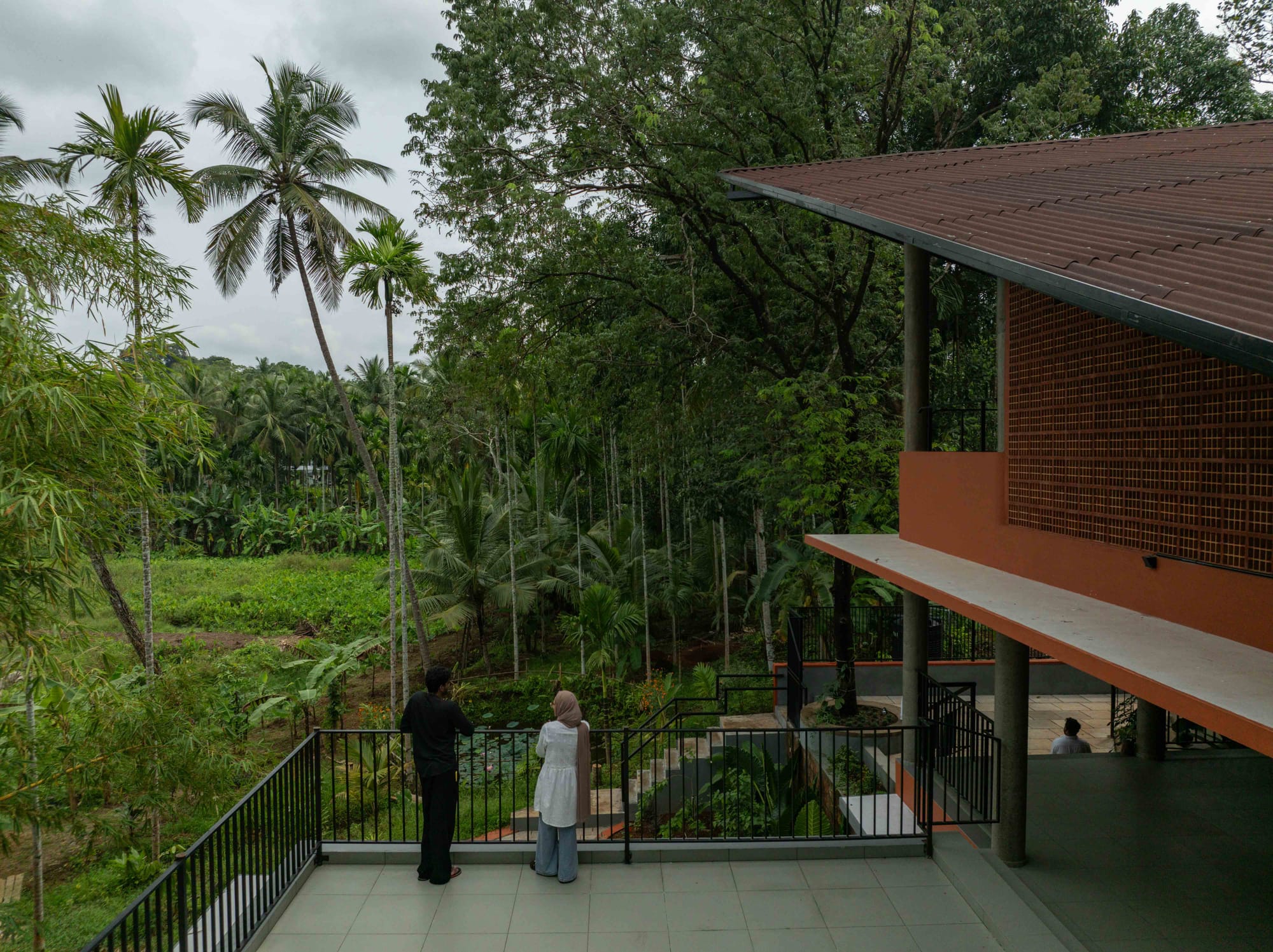 Material choices remain restrained and context-friendly: oxide-finished walls, terracotta jaalis for filtered ventilation, exposed concrete frames, and composite cellulosic bitumen roofing sheets. The palette allows the structure to recess into the plantation environment, prioritising shade, ventilation, and unobstructed views toward the field and pond.